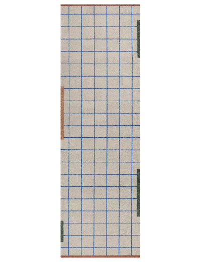 The NETWORK runner from Mette Ditmer is a functional statement piece with graphic character and bold contrast. A cobalt blue grid pattern is combined with colour blocks in olive-green and red, all framed by a deep wine-red border that adds warmth and depth.