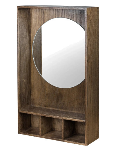 A functional statement piece with subtle 1970s references. The SHOW-ME mirror shelf combines a circular mirror with slim shelves in dark-oiled oak veneer. With space for keys, perfume or decorative objects, it works beautifully in a hallway, bedroom or dressing area.