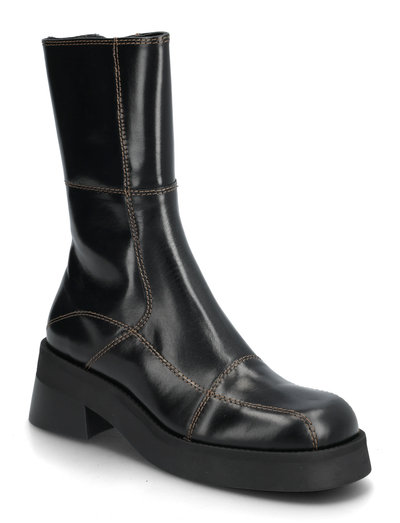 Chunky Plateausohlen verleihen diesen Stiefeletten einen selbstbewussten Auftritt. Detaillierte Kontrastnähte verleihen der eleganten Silhouette einen Hauch von optischem Interesse. Diese Stiefel sind eine vielseitige Ergänzung für jede Garderobe.