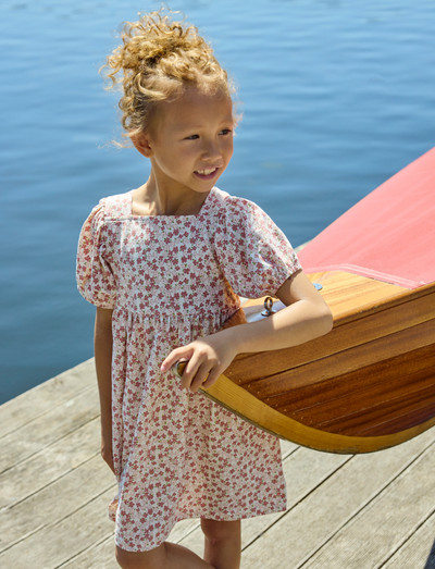 Short-sleeved dress from Minymo. The dress has an all-over print. It has a square neckline and puff sleeves. Made with certified organic cotton. Certified acc. to GOTS - organic CERES-0366