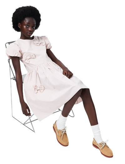 This charming knee-length dress features delightful stitched bows and is crafted from soft cotton. Designed for a relaxed fit, it showcases puff sleeves and a hidden zipper at the back, ensuring easy on-and-off and a comfortable fit. Ideal for kids who love to play while looking cute, this dress combines fun and functionality perfectly.