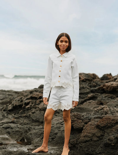 This denim jacket offers a stylish twist for children, featuring elegant floral embroidery and a scalloped hemline. Designed with a classic shirt collar and easy-to-use snap or jeans buttons based on size, it's perfect for warm weather adventures. Lightweight yet durable, it ensures comfort while adding a fashionable touch to any outfit. A delightful addition to any young one's wardrobe.
