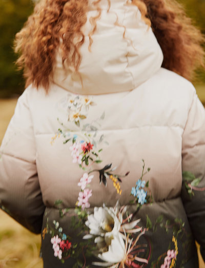 This jacket is made of recycled polyester and features a print. It is designed with a practical zip closure, high collar, detachable hood, front pockets, an inner pocket, ribbed cuffs, and adjustable elastic at the bottom to help against the wind. A large reflector on the back increases visibility in traffic.
