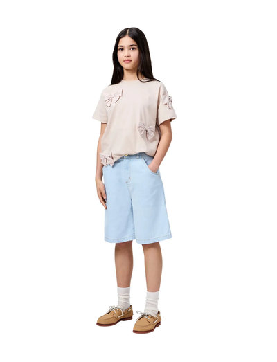 Soft cotton t-shirt with short sleeves and a ribbed neckline, designed for comfort and easy wear. The relaxed fit allows for freedom of movement, making it perfect for playful days. The charming bows on the front add a delightful touch, making this a stylish addition to any child's wardrobe. Ideal for various casual occasions, this t-shirt combines playfulness with everyday practicality.