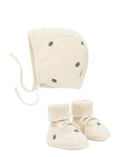 A soft and thoughtful welcome for the littlest ones. Delicately knitted in organic cotton, this set offers gentle warmth and all-day comfort. Finished with charming embroidery stitching, they bring a subtle, playful touch to any newborn outfit.0-3 months 3-6 months 6-9 months