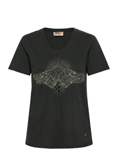 This fitted tee is designed with intricate detailing at front. It’s adorned with partly hand-beaded and embroidered artwork of angel wings and a radiant sunburst design. A true work of art. Perfect for pairing with jeans for a casual chic look or styling under a blazer for a polished look.