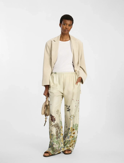 Diese Hose aus reiner Seide zeigt einen botanischen Print entlang der Beine. Sie ist gerade geschnitten, hat einen elastischen Bund und eine entspannte Silhouette, was sie zu einer mühelosen Wahl für ein gehobenes Alltagsoutfit macht. Ein Design, das sowohl einzeln als auch als Teil eines Sets mit dem passenden Hemd funktioniert.