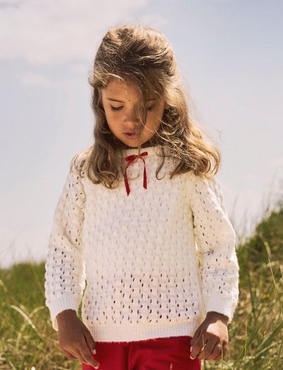 Dieser gestrickte Pullover hat ein zartes Lochmuster und ein süßes Schleifendetail am Ausschnitt. Er ist eine stilvolle und bequeme Wahl für jeden Anlass.