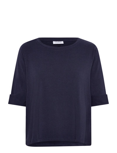 Dieses Oberteil aus einem weichen Tencel-Baumwoll-Gemisch ist atmungsaktiv und bequem. Es zeichnet sich durch einen klassischen Rundhalsausschnitt und stilvolle, halblange Ärmel mit sauberen Aufschlägen aus.