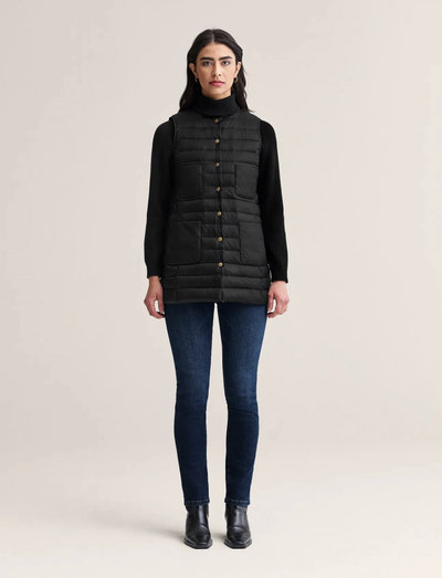 Diese leichte Daunenweste wurde für das Tragen im Lagenlook entworfen und bietet Wärme, ohne aufzutragen. Mit einer Knopfleiste vorne und praktischen Taschen ist dieses zeitlose Kleidungsstück ideal für die Übergangszeit oder als zusätzliche Isolationsschicht unter schwereren Mänteln.