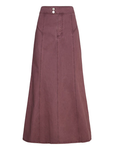 Dieser lange Jeansrock bietet eine ausgestellte Passform mit einer dezenten A-Linien-Silhouette. Breite Steppnähte setzen ein besonderes Detail, ergänzt durch einen klassischen Knopfverschluss.