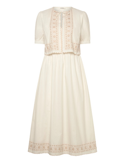 Dieses elegante zweiteilige Kleid besticht durch ein Cape mit gestickten Kanten und einem Bindeband am Hals, was für einen raffinierten Look sorgt. Die Puffärmel mit Gummizug am Saum verleihen eine moderne Note, während der Rock mit Volumen und Raffungen oben für eine schmeichelhafte Passform sorgt. Ein unsichtbarer Reissverschluss an der Seite erleichtert das An- und Ausziehen, und die Taschen in der Seitennaht des Rocks bieten praktische Funktionalität. Die Stickerei am Saum des Rocks rundet das stilvolle Design ab.
