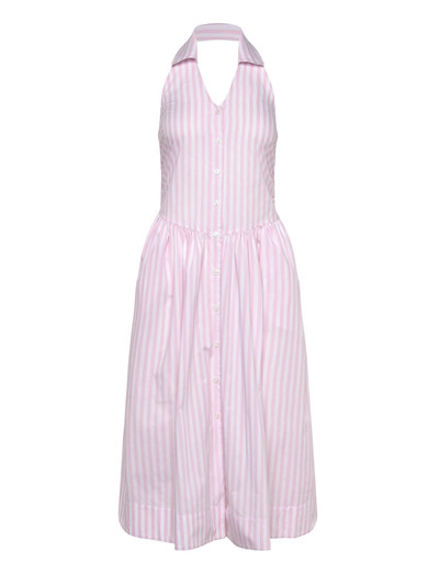 Dieses ärmellose Neckholderkleid mit schmeichelhaftem A-Linien-Rock und offenem Rücken sorgt für eine elegante Silhouette. Das Design verfügt über einen modernen V-Ausschnitt und eine Knopfleiste vorne, die ein luftiges und offenes Gefühl erzeugt. Brustabnäher sorgen für eine bequeme und taillierte Passform, wodurch es sich sowohl für zwanglose Ausflüge als auch für formellere Anlässe eignet.