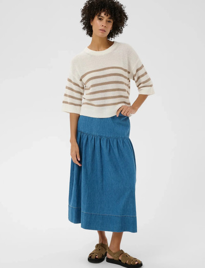 Dieser Rock aus Denim verfügt über einen bequemen elastischen Bund und ein dezentes Stufendesign. Der gerade Schnitt sorgt für eine zeitlose Silhouette und macht ihn zu einer vielseitigen Ergänzung für jede Garderobe.