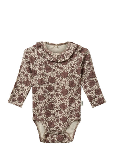 Dieser langärmlige Body mit zartem Blumenmuster bietet eine bequeme Passform. Das Design beinhaltet einen charmanten Rüschenkragen, der diesem essentiellen Kleidungsstück eine elegante Note verleiht.
