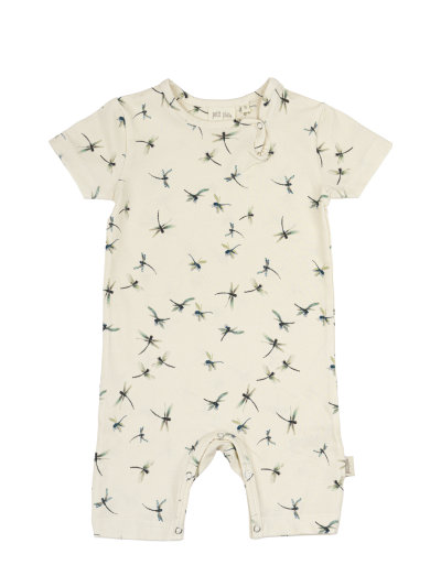 Short-sleeved jumpsuit with watercolor print from Petit Piao in organic cotton. The prints are inspired by nature and everything around Jutland's west coast. The prints are with an offwhite background, so the print is in focus. In the left side of the neck opening there is a push button which makes it easier to get the jumpsuit over the child's head. There are push bottons in the leg opening. Produced in India.