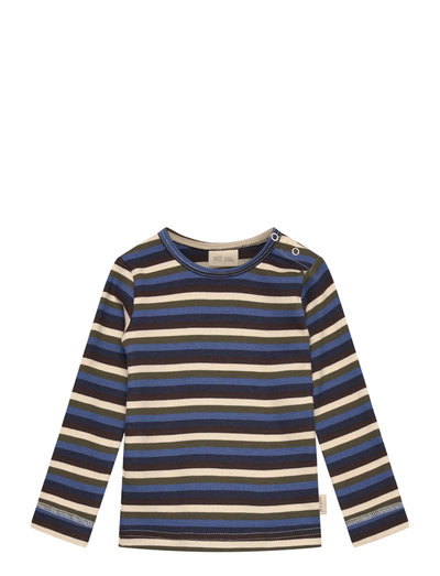Long sleeved T-shirt made in our classic rib quality but in a new multi stripe. Size 74-92 have push button for easy opening in the shoulder seam. Size 98-122 has no push buttons. The material is soft and very stretchable, made for comfort and play. Made in India.