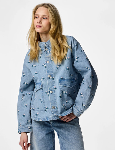 Dieses langärmlige Hemd aus robustem Denim verfügt über einen klassischen Kragen und eine normale Passform. Das Design wird durch zarte Blumenstickereien aufgewertet, die diesem Basic-Kleidungsstück einen Hauch von Eleganz verleihen.