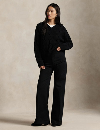 Dieser Pullover mit V-Ausschnitt ist aus einer Mischung aus italienischer Wolle und Kaschmir gefertigt und bietet eine entspannte Passform mit einem grosszügigen Zopfmuster. Die Silhouette ist so konzipiert, dass sie auf der Hüfte sitzt und einen bequemen und stilvollen Look bietet.