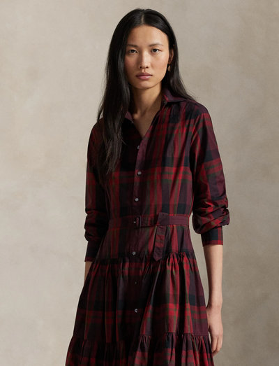 This season’s shirtdress combines classic menswear-inspired details, like a spread collar and buttoned placket, with the voluminous shape of a tiered skirt. The A-line silhouette is enhanced by princess seams and a buckled self-belt at the waist.A-line silhouette. Intended to hit above the ankle.US size 8 has a 50" body length and a 33" sleeve length. Dress length is taken from the center back of the neck and changes 0.25" between sizes. Sleeve length is taken from the center back of the neck and changes 0.25" between sizes.Spread collar. Buttoned placket. Shell buttons.