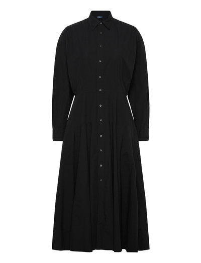 Dieses Hemdkleid aus glattem Baumwoll-Canvas zeichnet sich durch ein Design mit Einsätzen aus, das die Illusion eines zweiteiligen Ensembles erzeugt. Es hat ein entspanntes Oberteil, das in einen ausgestellten Rock übergeht und so eine bequeme und dennoch stilvolle Silhouette bietet. Die Knopfleiste und der gespreizte Kragen verleihen diesem mittellangen Kleid klassische Akzente.