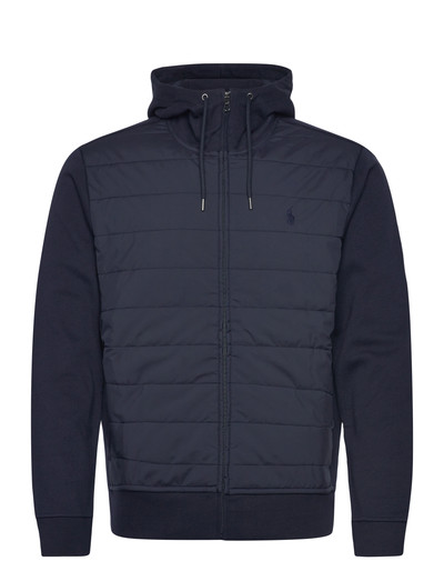 Diese Hybridjacke bietet Wärme und Stil mit einem gesteppten Rumpf und Strickärmeln. Das Design mit Kapuze bietet zusätzlichen Schutz vor den Elementen und macht sie zu einer vielseitigen Wahl für kühlere Tage.
