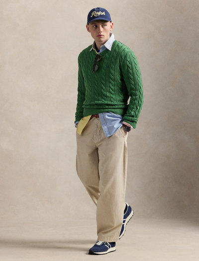 This cotton sweater combines two of Polo’s most iconic design elements: a textural cable-knit motif and our signature Pony.Regular Fit: wider at the chest while still maintaining a modern silhouette.Size medium has a 26.5" body length (front and back), a 16.75" shoulder, a 41" chest, and a 25.25" sleeve length.Crewneck.