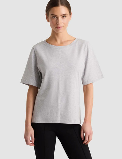 Dieses kurzärmlige T-Shirt ist leicht tailliert geschnitten, um eine schmeichelhafte Silhouette zu erzeugen, und verfügt über einen runden Ausschnitt sowie elegante Schneidetdetails. Die dezente Taillenformung verleiht diesem entspannten Modell einen Hauch von Eleganz.