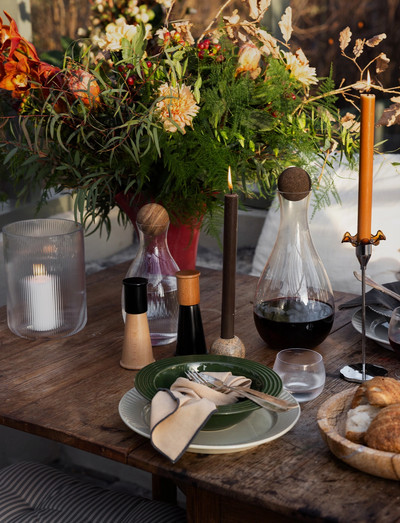 Nature wine carafe with cork lid combines sustainability, flowing shapes and mystery. The dark brown cork ball creates character and makes us think of bottles which have traveled along the sea bed containing beautiful little messages. In the present the brown colour signals luxury and the cork sustainability. The shape of the carafe is wavy and harmonizes with the glass series Saga. The carafe is available in two sizes and shapes.