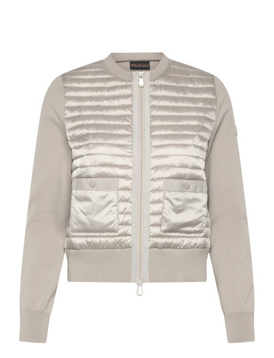 Diese Jacke kombiniert eine gesteppte Vorderseite mit Strickärmeln und -rücken und bietet so eine elegante Option für den Übergang. Sie verfügt über Taschen mit Druckknopfverschluss, einen Reissverschluss und Rippstrickabschlüsse, was sie sowohl stilvoll als auch funktional macht. Ein tonales Abzeichen auf dem Ärmel setzt einen unverkennbaren Akzent.