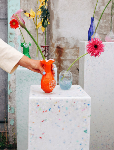 Sigrid 90 Canary is made from 100 pct. recycled and recyclable plastic, mainly from cosmetic packaging. It is designed and produced in Denmark. The colors originate from the original plastic, and that is why no Sigrid 90 is the same. Sigrid is a comfortable stool or a small table. It is light and stable at once and therefore easy to move around. She looks good inside or outside on a terrace - or alone as a bed table or stool in the bathroom. Sigrid is robust and weather resistant.