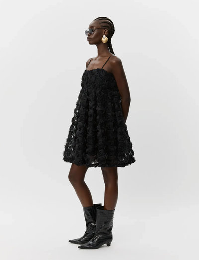 Dieses Minikleid besticht durch ein fesselndes, dreidimensionales Rosendesign und verfügt über feine, dünne Träger sowie einen dezenten Mesh-Effekt. Ein verdeckter Reissverschluss sorgt für eine nahtlose Silhouette.