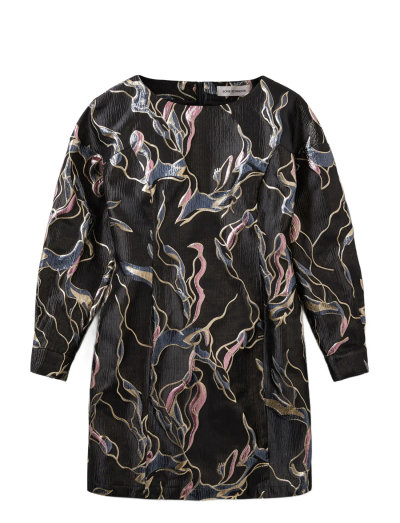 Dieses Midikleid mit einem Hauch von Metallic-Schimmer zeichnet sich durch einen schmeichelhaften Taillenschnitt und lange Ärmel aus. Das Design umfasst Falten an den Schultern und einen U-Boot-Ausschnitt, der mit einem Reissverschluss auf der Rückseite abschliesst.