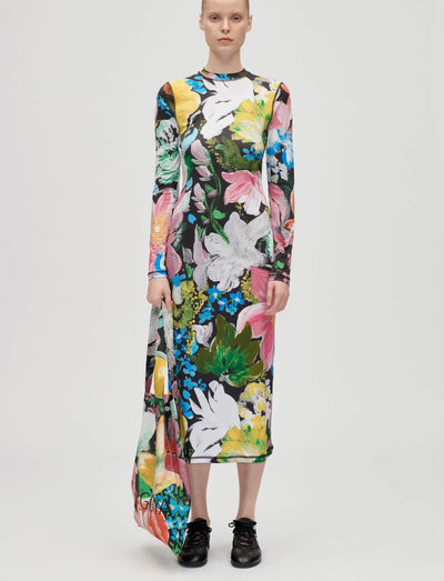 Dieses Midikleid aus weichem, dehnbarem Material verfügt über lange Ärmel und einen klassischen Rundhalsausschnitt. Die Bodycon-Silhouette wird durch einen Allover-Blumendruck betont, was es zu einem herausragenden Stück macht.