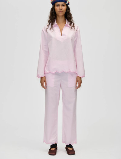 Loose fitDieses langärmlige Tunika besticht durch zarte Muschelkanten und dezente Stickereien, die ihm eine raffinierte Note verleihen. Der V-Ausschnitt unterstreicht die schmeichelhafte Silhouette und macht sie zu einer vielseitigen Ergänzung für jede Garderobe.