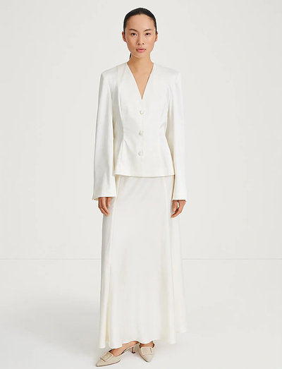 Diese Bluse aus schimmerndem Satin zeichnet sich durch eine vorteilhafte, taillierte Passform und strategisch platzierte Nähte aus. Das Design umfasst einen V-Ausschnitt, lange Ärmel mit dezenten Schlitzen und einen Verschluss mit drei Knöpfen.