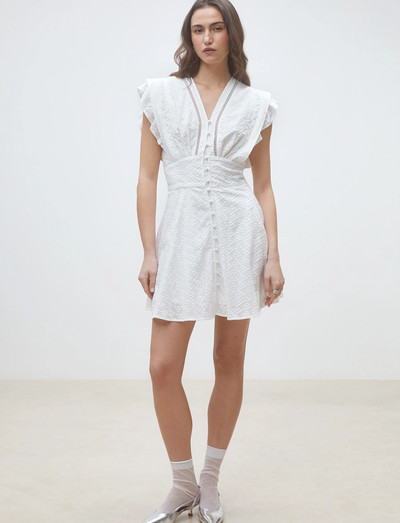 Volantärmel und eine durchgehende Knopfleiste prägen dieses charmante Kleid. Der V-Ausschnitt und die dezenten Taillendetails sorgen für eine schmeichelhafte Silhouette, perfekt für warme Tage.