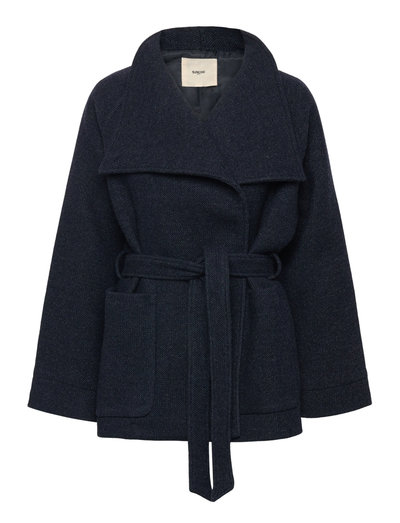 Diese Jacke mit ihrem breiten, drapierten Kragen bietet eine elegante Silhouette. Das Design verfügt über einen Bindegürtel in der Taille, der die Passform betont und eine schmeichelhafte Form erzeugt. Abgerundet wird sie durch praktische aufgesetzte Taschen.