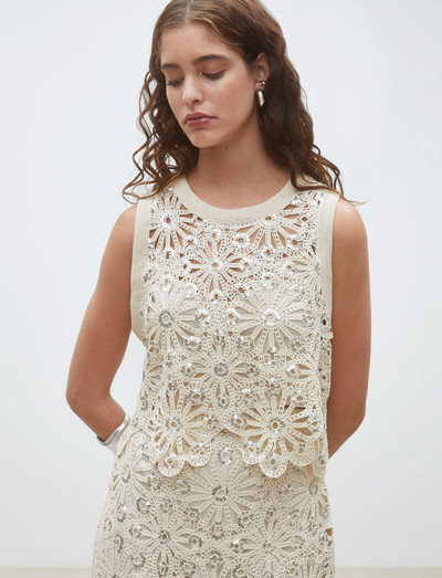 Zarte florale Häkelarbeit und dezente Paillettenakzente definieren dieses ärmellose Top. Der gewellte Saum verleiht einen Hauch von verspieltem Charme und macht es zu einem herausragenden Stück für jeden Anlass.