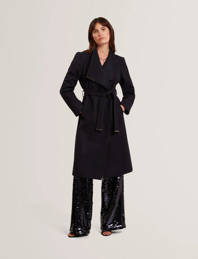 Dieser Wollmantel bietet eine raffinierte Silhouette mit einem Stehkragen und einem Bindegürtel, um die Taille zu betonen. Seine klaren Linien und das minimalistische Design machen ihn zu einer vielseitigen Ergänzung für jede Garderobe, die sich für verschiedene Anlässe leicht elegant oder leger kombinieren lässt.