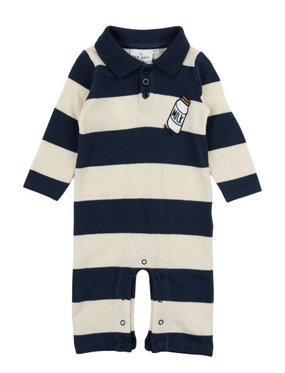 Hop into this lovely spring outfit with wide white and blue stripes, and let the adventure begin! Stylish details with a shirt collar, decorative buttons, and a small chest pocket. It is a soft, lightweight, and breathable outfit that provides your child with high comfort and freedom for play and movement.