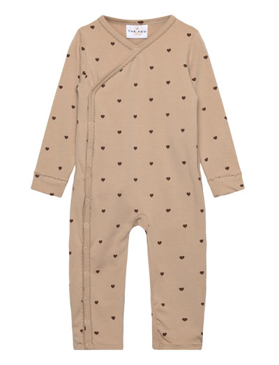 Long-sleeved wrap jumpsuit in a beautiful, color with small, delicate heart prints. The jumpsuit features a practical wrap design with snap buttons along the front and inside the legs, making it easy to put on and take off. The soft cotton fabric provides maximum comfort and freedom of movement, perfect for both everyday wear and relaxed moments. This jumpsuit is available in 2 colors. - Wrap design with snap buttons - Long-sleeved - Snap buttons along the legs for easy dressing - Soft and breathable material - Adorned with a fine decorative trim- GOTS Organic certified by CU842535