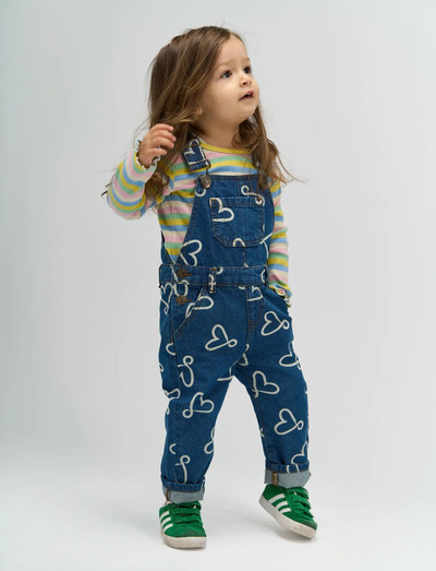 Playful and practical, these denim dungarees are made for toddler adventures. Crafted from 100% cotton, they feel soft against the skin while staying sturdy for everyday wear. The all-over heart doodle print adds a cheerful twist, and the straight-leg silhouette layers easily over tees or sweaters. Adjustable shoulder straps and side buttons make dressing simple and allow room for growth. A roomy bib pocket and front pockets keep little treasures close at hand. Designed for movement and comfort, they balance durability with a cute, expressive look.- Adjustable shoulder straps for a grow-with-them fit- Easy side button closures for quick changes- Functional bib and side pockets for small essentials- Soft, durable 100% cotton for all-day comfort and play