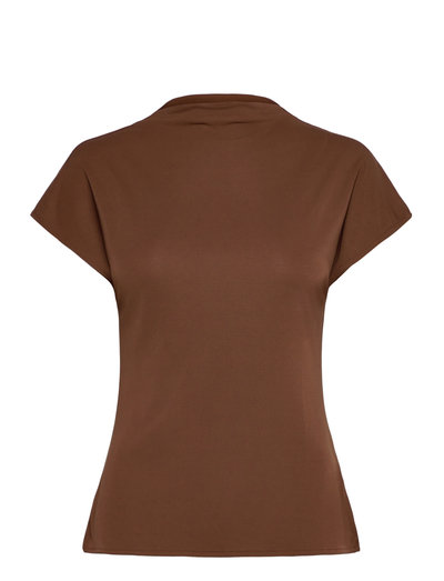 Dieses kurzärmlige Top aus fliessendem Viskosejersey bietet eine bequeme, reguläre Passform. Der niedrige Trichterkragen sorgt für einen Hauch moderner Eleganz, während der gerade Saum eine klare, hüftlange Silhouette schafft.