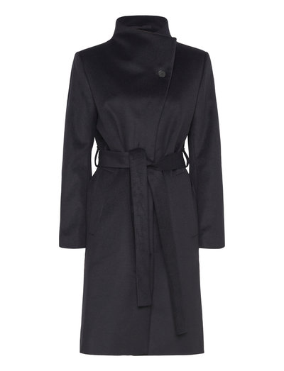 Knee-length belted coat with funnel neckline