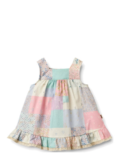Sleeveless dress with patchwork print in soft woven organic cotton for babies.- Wide straps with unique neckline- Two layered yoke- Cutline at the chest with lots of gatherings below- Narrow facing at lower armhole- Small ruffle with lace at the bottom hem- Unique signature patchwork printA woven summer dress is a must-have for sunny days. Light, airy, and designed for effortless movement, its perfect for warm-weather adventures. With delicate details and charming prints, this dress captures the essence of summer whether for everyday play or special occasions. ---100% Organic cotton