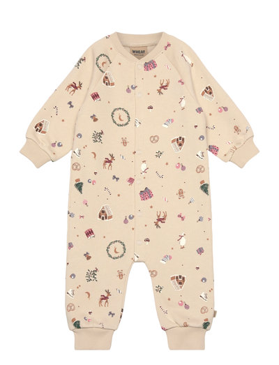 Long-sleeved jumpsuit in soft organic cotton for your baby. - Loose fit- Raglan sleeves- Rib collar and cuffs- Folded rib edges at the leg hems- Press buttons down the front- Wheat signasture print with Christmas motifsWheat's jumpsuit for babies is both cute and comfortable. The jumpsuit has press buttons down the front, which makes it easier for you to dress your baby. The jumpsuit can be worn on its own or as an extra layer underneath everyday clothing. ---- Standard 100 by OEKO-TEX®- 100% Organic cotton- GOTS certified
