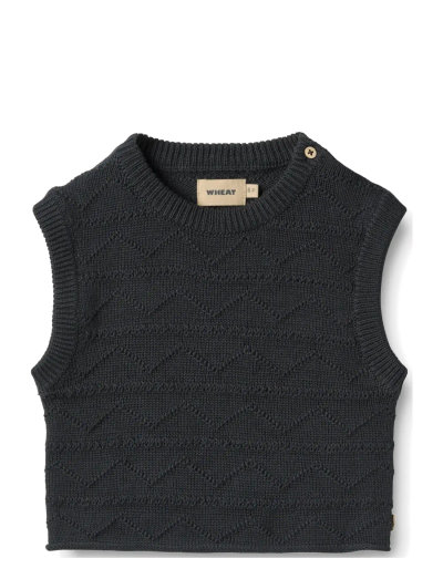 Knit vest in soft cotton for your baby. - Regular fit- Rib at the neckline and sleeve openings- Rolled edge at bottomhem- Zig zag structured knit pattern at the front- Opening at left shoulderWheat's knitwear is a true essential during the cold autumn and winter months, as it is soft and comfortable for your child to wear without any kind of itchiness. The vest is perfect as an extra layer on colder days and works well over a shirt or dress for special occasions.---- Standard 100 by OEKO-TEX®- 100% Organic cotton- The product is GOTS certified