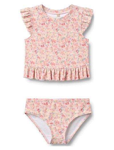 Two-piece bathing set designed for comfort and fun for children. - Top: Frills at shoulders and bottom - Extended length swim top- Bottom: Plain fit for great comfort- Signature printSwimwear ensures a snug fit and allows for unrestricted movement during water activities. It is perfect for a day at the beach or swimming pool. All our swimwear is predominantly made in recycled polyester and is comfortable for your child to wear and move in.The style is with UV 40+/UPF 40+ protection. ---- 83% Recycled polyester, 17% Elastane- GRS certified