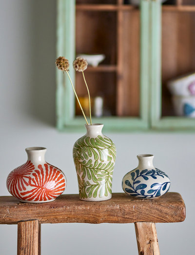 The Fauni Vases by Creative Collection are a decorative set of three small vases. The vases are hand-painted with plant motifs in three different lovely colors; green, red, and blue. Each vase will be unique, as each brushstroke adds a personal touch and creates small variations in the design.